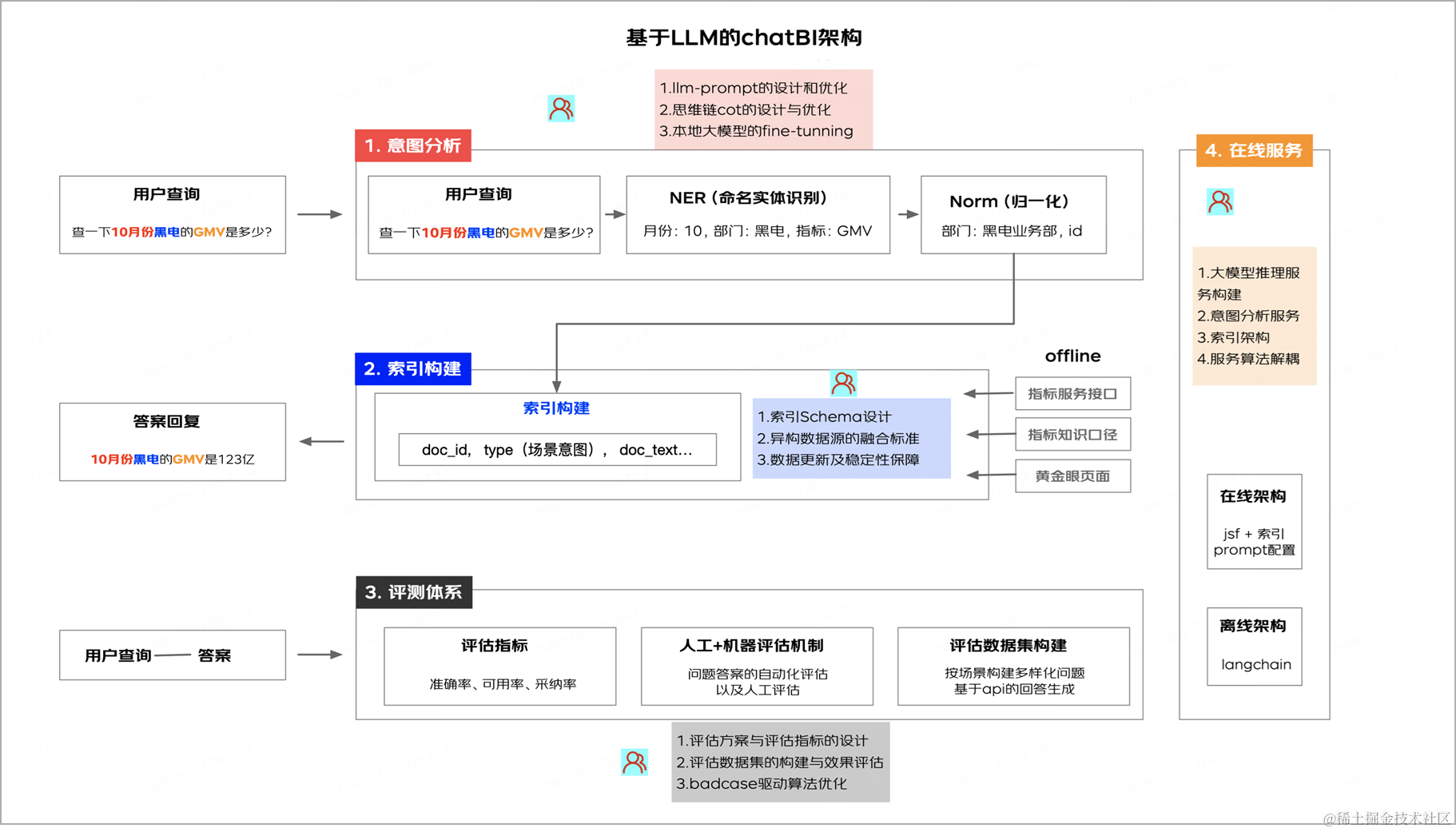 对于京东复杂的业务和数据体系,大模型在数据服务领域的应用很有价值,同时也面临着挑战。当前的架构设计充分考虑了已具备的底层数据服务能力,结合LLM实体识别、上下文推理、决策辅助能力将用户查询与复杂数据集的相关指标匹配,实现快速准确的数据查询。通过NER识别将用户的筛选条件、查询指标、聚合方式抽取出来,利用Norm(归一化)把实体转换成标准数据服务的调用参数,并且构建索引将归一化依赖的数据资产进行存储,来实现自然语言查询准确数据的全链路,与此同时,建立完善的评估体系、利用本地模型优化等机制,不断提升应答准确率,为用户带来更优质的使用体验。