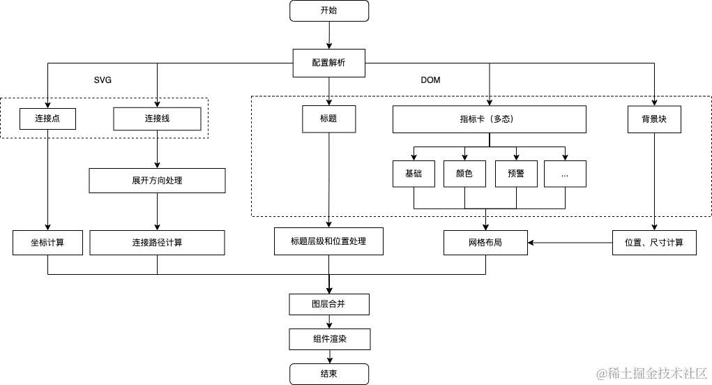 在具体的技术实现上,针对点、线、卡片的位置计算和绘制,采用了类似杜邦分析的技术思路,前端动态计算节点、链接关系位置,并使用svg等前端技术进行渲染。除此之外由于图表结构和逻辑比较复杂,如何设计该图表的配置化方案,成为了另一个技术难点。为此,针对标题部分我们抽离行、列标题组,复用流程标签组件的配置逻辑;针对卡片本身,复用了原先指标卡的配置逻辑;针对指标卡的位置和连接关系,用户能够通过行列坐标的设置和关系绑定来进行细粒度配置,同时为了节省用户的配置成本,组件会在初始化的时候进行默认编排。
