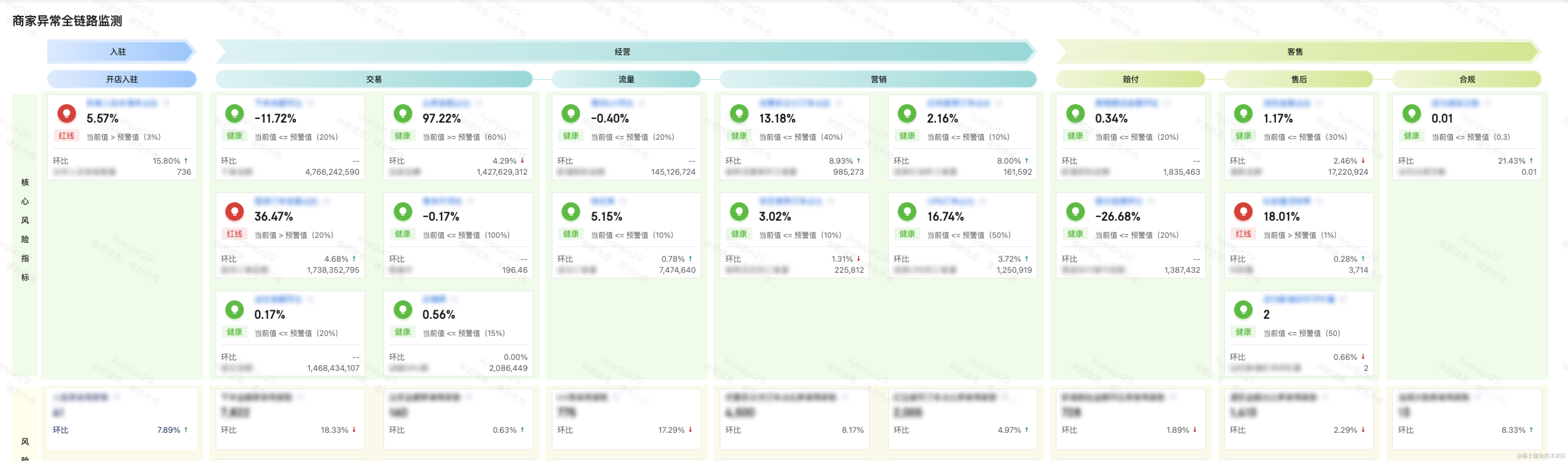 最终在商家异常全链路监测需求中使用网格指标卡组件,针对3个环节、7个模块、19类的核心指标与异常类型商家数量,让用户能够从商家经营整体环节通过预警功能进行风险监控和异常定位。