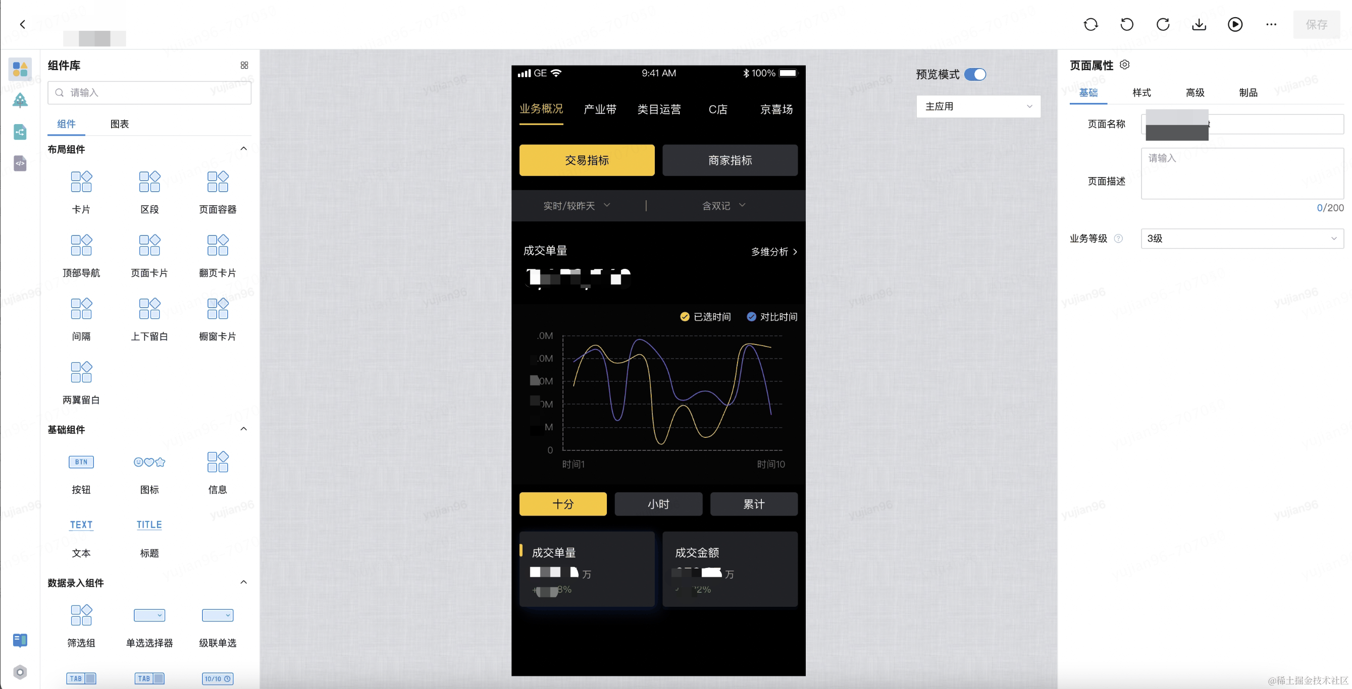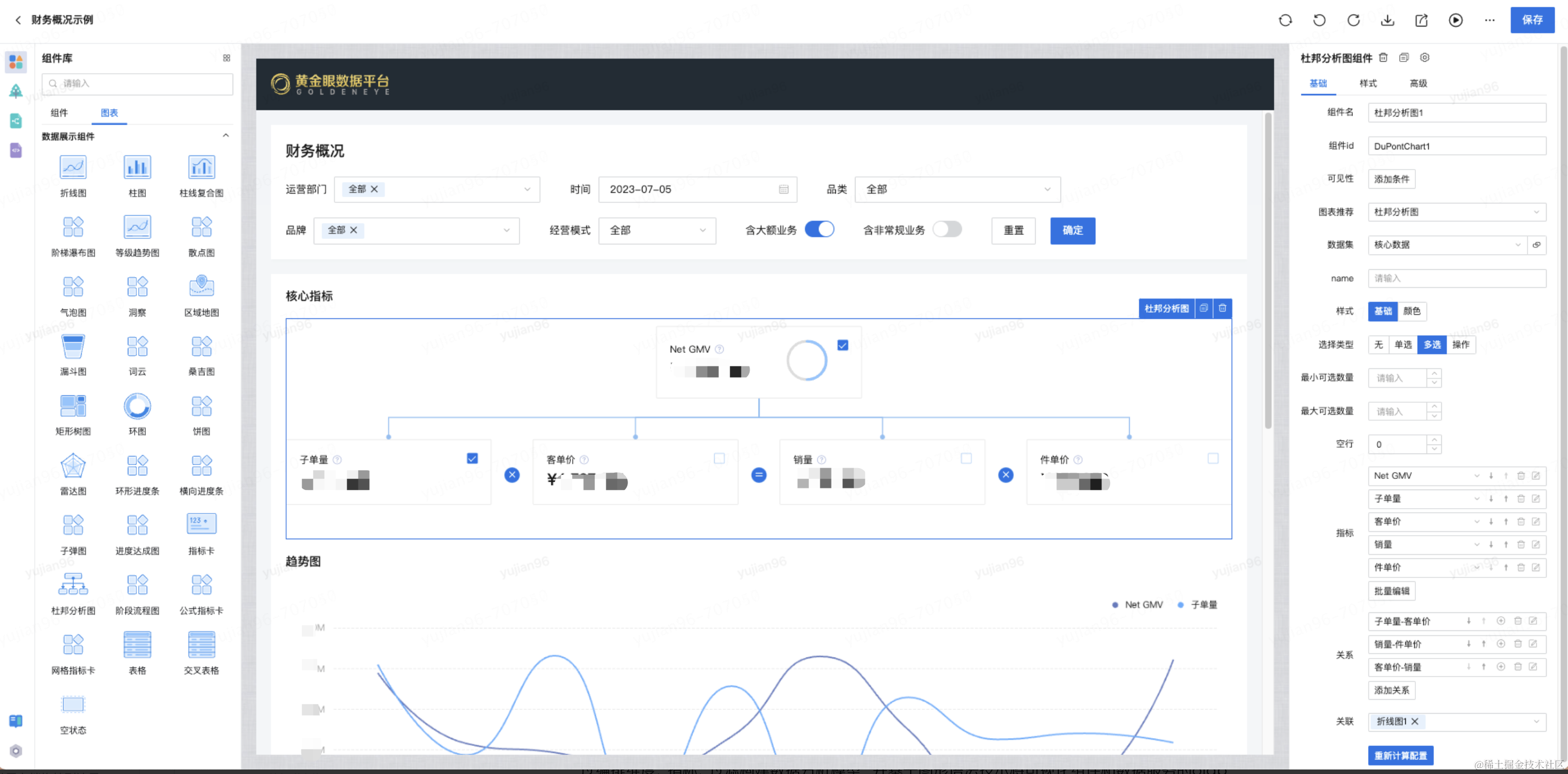 其次是基于JMT组件库自研了可视化编排系统,一方面,通过多种灵活的布局组件,支持复杂页面布局的编排。另一方面,提供了灵活的组件配置面板,除常规样式的编排外,还充分发挥底层数据可视化能力,支持如杜邦分析等指标关系的编排。此外,通过对底层React框架的灵活使用,创新组件嵌套机制,支持可视化组件互相嵌入形成联动分析,如在杜邦分析中既展示GMV的拆解,也展示GMV的达成进度等。