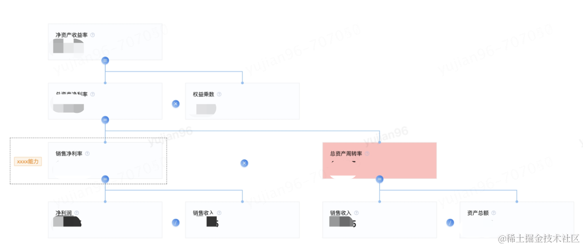杜邦分析法(DuPont Analysis) 是一种综合利用多个财务指标比率关系来拆解企业财务状况的分析方法。其基本思想是将企业净资产收益率逐级分解为多项财务比率乘积,这样有助于深入分析、比较企业的经营业绩。由于这种分析方法最早由美国杜邦公司使用,故名杜邦分析法。 使用杜邦分析法可以清晰描述指标体系内指标的层次和指标间的关系。如下图所示,杜邦分析法通过树形结构自顶向下的展示了指标间的构成和层级关系,同时通过指标之间的运算符号清晰展现出指标之间的计算关系,例如“净资产收益率=总资产净利率 * 权益乘数”、“总资产净利率=销售净利率 * 总资产周转率”、“销售净利率=净利润 / 销售收入”、“总资产周转率=销售收入 / 资产总额”。采用这一方法,可使财务比率分析的层次更清晰、条理更突出,为报表分析者全面仔细地了解企业的经营和盈利状况提供方便。