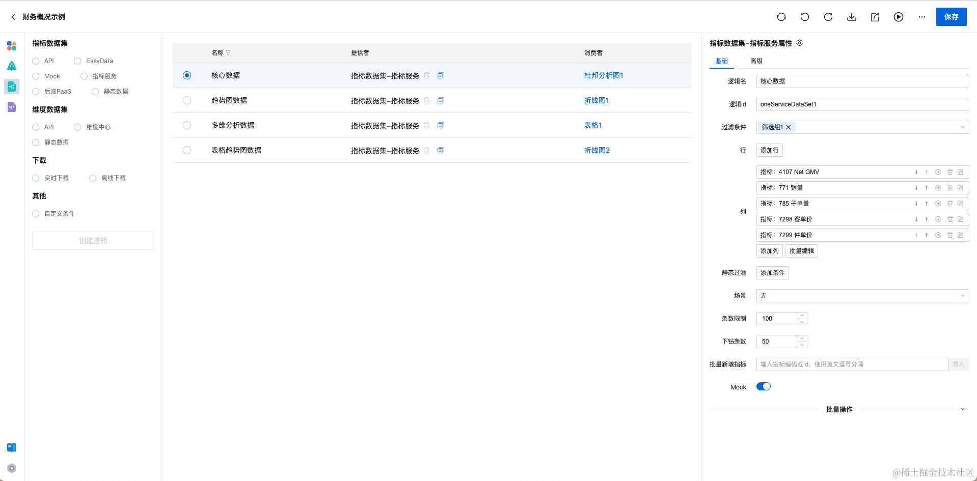 第三是构建数据产品特有的数据集编排系统,支持对数据资产、EasyData等多种数据源,通过编排维度、指标、过滤构建数据分析模型,并基于图形语法技术将可视化组件和数据服务的olap能力做充分打通,实现数据驱动可视化。