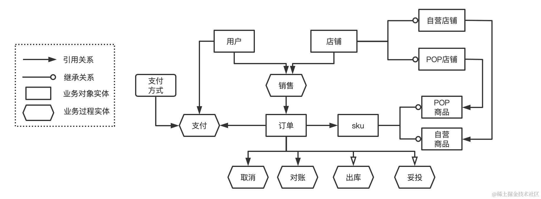 将业务流程中的实体(包括业务活动和业务对象)之间的关系构建出来,变成交易主题下的概念模型: