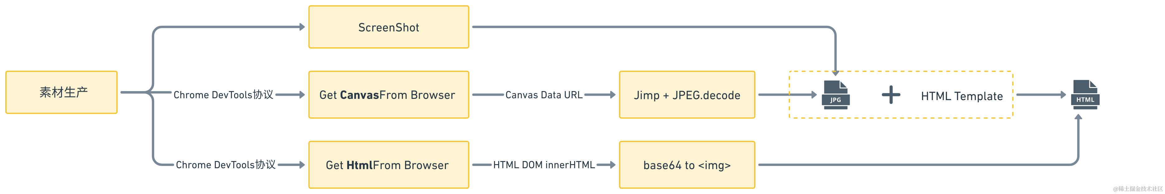在处理阶段,由于Canvas对象是Web API的一部分,只能在浏览器环境中使用。而常用的Node下操作Canvas的工具包几乎都依赖底层的图形库,例如Cairo或Skia等。这对于开发环境(MacOS)和部署环境(CentOS)不一致的研发来说,调试难度较大。为了解决这个问题,通过Node.js环境提供的Buffer对象承接Canvas对象的Data URL,配合JPEG图像编解码器处理。这样就无需考虑底层图形库的兼容性和安装问题,实现素材图片的顺利生成。