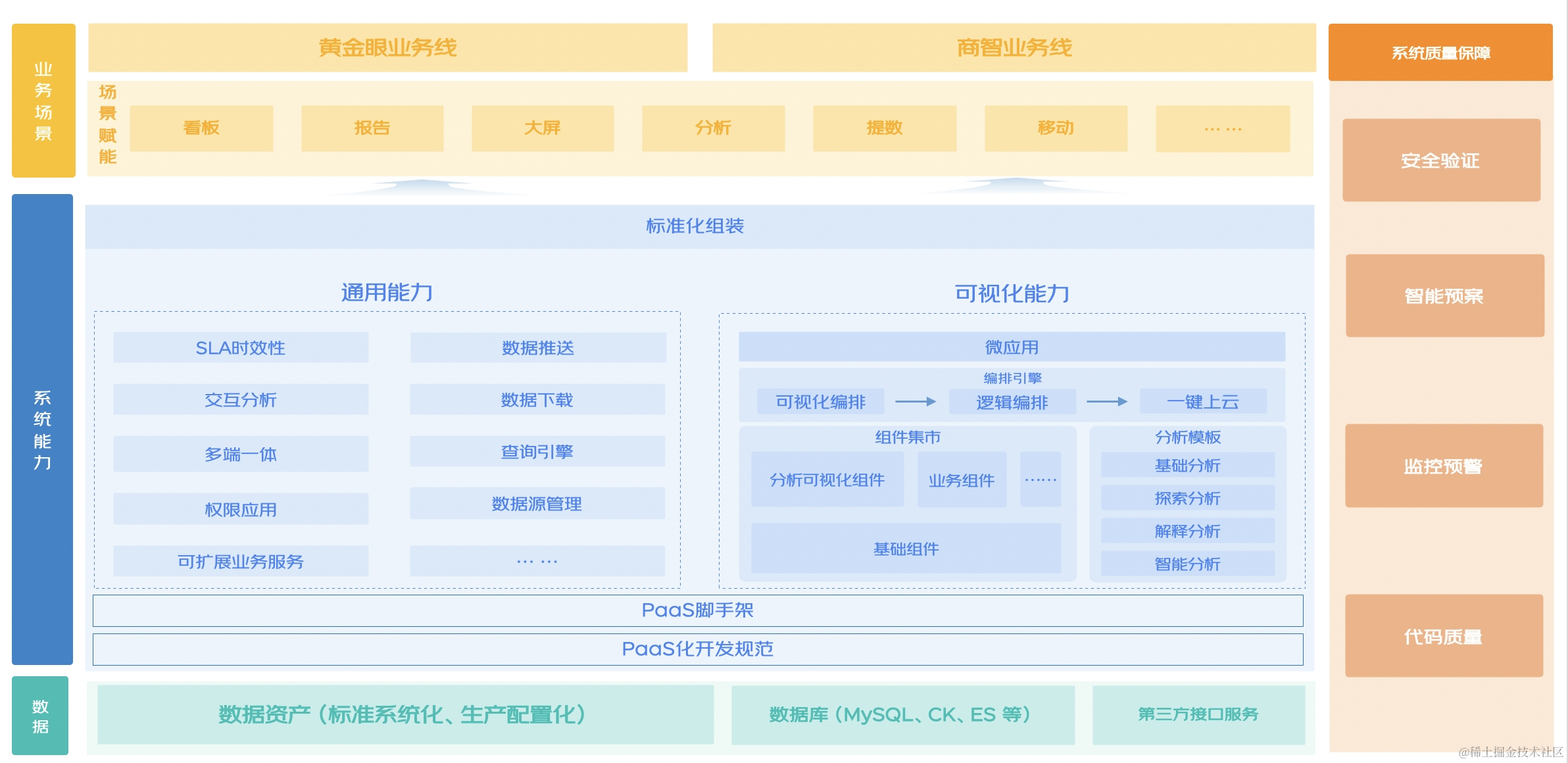 在数据驱动业务运营的策略下,以高效灵活、场景化、智能化为目标,整合数据资产和工具,以可视化组件和低代码平台为核心,打造黄金眼、商智等标杆的数据应用,实现对不同业务场景的快速赋能。我们通过持续建设系统能力,赋能看板、报告、大屏、分析、提数等多个业务场景,同时从4大方向纵向拉通系统质量保障建设,提升系统稳定性,最终实现在复杂多变的业务场景下,通过功能插拔、动态配置,构建一站式的解决方案。