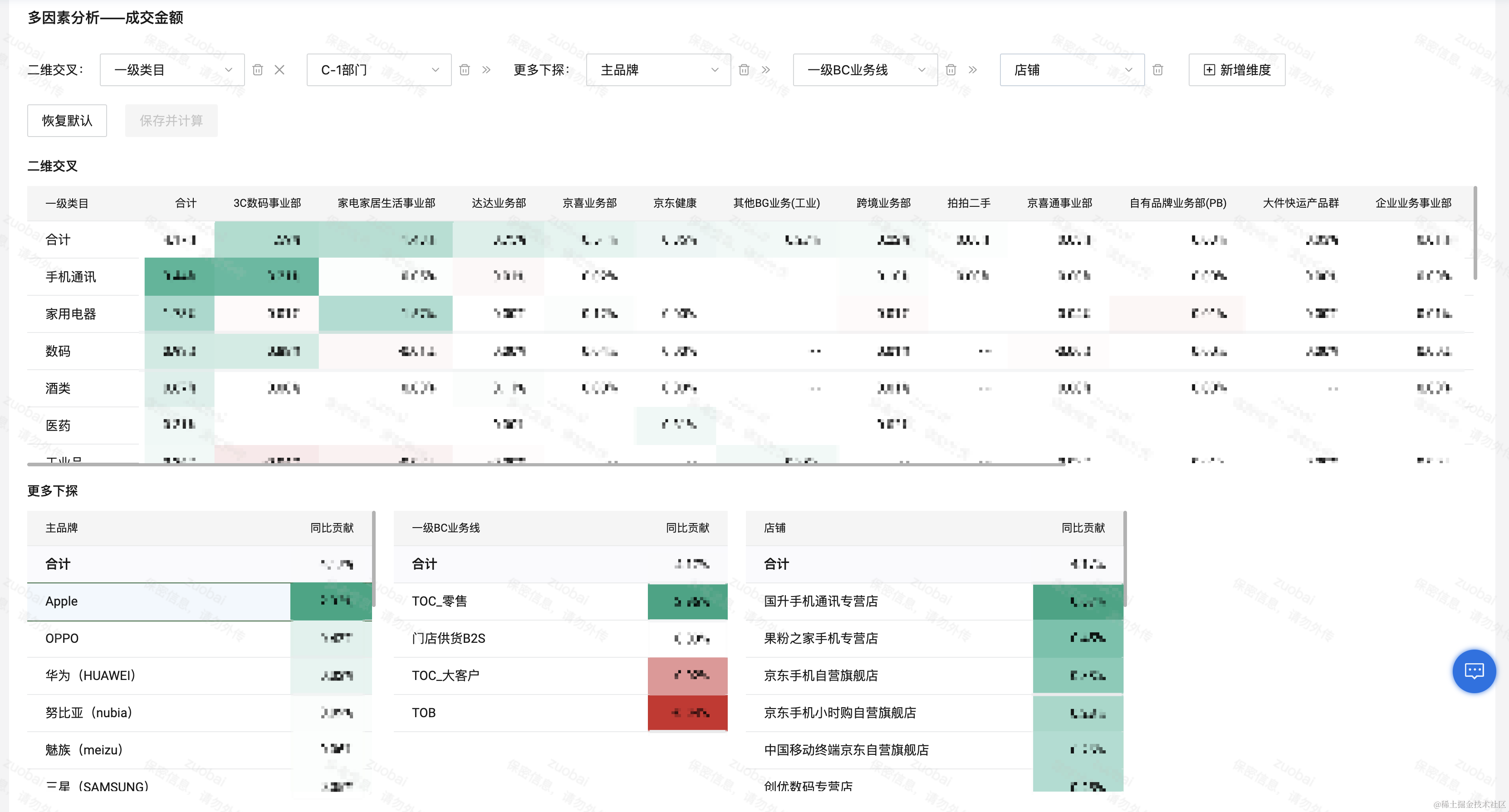 同时,基于自动分析结果,还可以进一步通过多因素分析等可视化分析组件进行更深入的探查。基于表格组件,通过组件联动能力,组合多个表格形成联动下钻分析。
