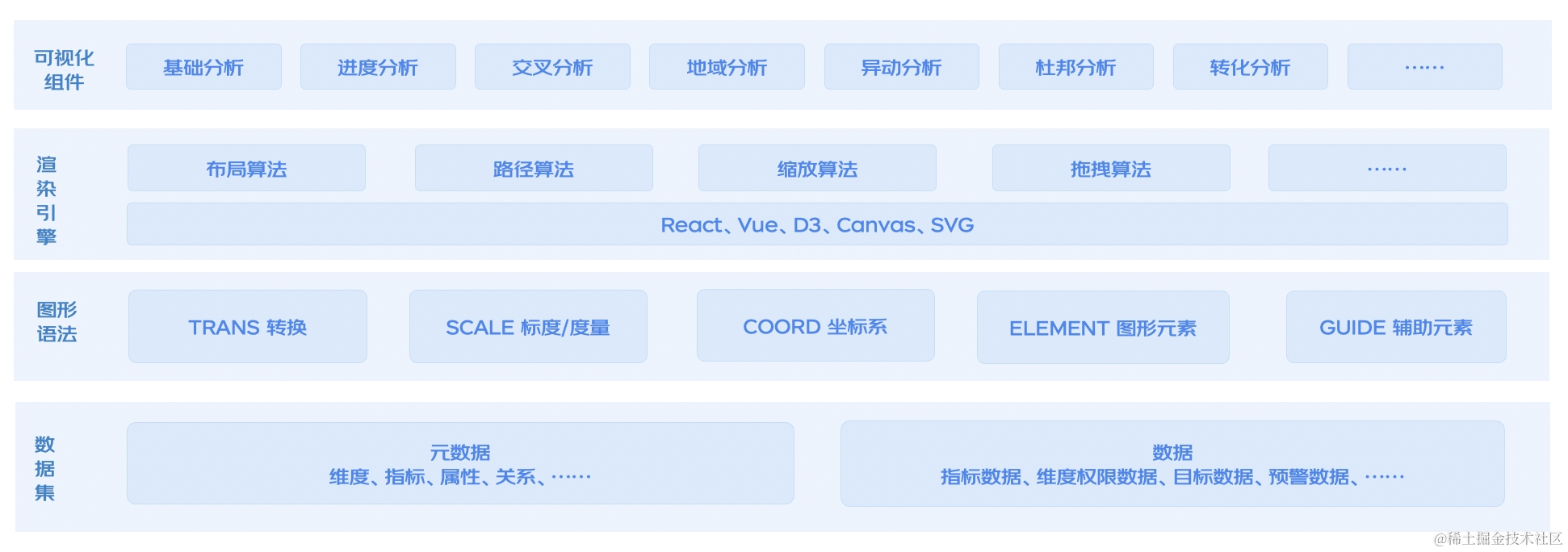 分析可视化组件底层均采用了业界先进的图形语法理论。图形语法是一种将抽象基本元素组合成图表的规则。图形语法深层次地反应出统计图形的层次结构。在图形语法学中,一般统计图表的规格主要包含6个要素: