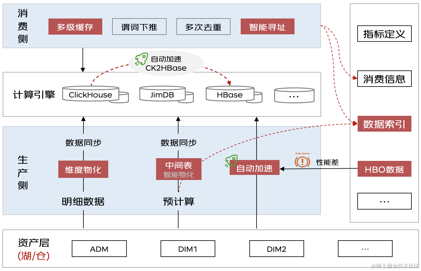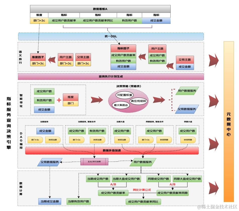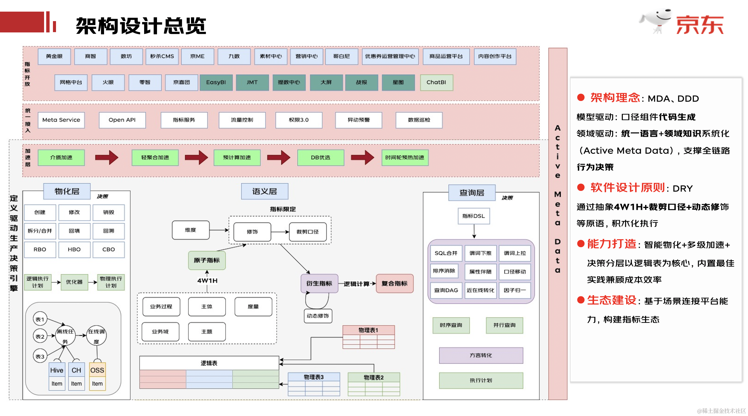 在架构设计上我们参考了MDA和DDD的思想,希望通过口径组件实现自动生成代码并统一查询语言,支持全链路行为决策;通过DRY的原则抽象指标定义相关可积木化执行的原语,以便于基于数据应用的场景连接底层平台能力;从图中可以看到整体架构分为物化层,语义层,和查询层。在整个过程中都会伴随数据加速,通过统一接入层开放给各个产品端或可视化工具来使用,物化层用来回答前面的存不存,存多久,存哪里,怎么存的问题;语义层用来通过系统将业务语言转化为机器语言,查询层用来回答数据去哪拿、怎么拿、怎么拿最快的问题,最上面蓝色部分为各个消费指标产物的产品端,深绿色是可视化工具,浅绿色是正在孵化阶段的基于GPT的数据分析工具。