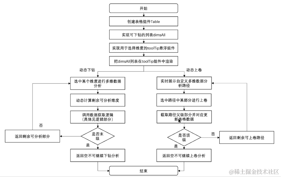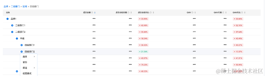 为解决复杂的数据分析场景,创建了一种基于React技术自研的交叉分析表格组件,将常见的表格操作与交叉数据分析的思路结合起来:在传统可下钻表格的基础上,创新地抽取分析动作层,能够类比数据分析中的切片、切块和下钻思路,进行数据分析,使用时允许用户在多个合法维度中选择,形成一条自定义下钻路径,成功地实现多种维度下,在表格中进行可下钻的交叉数据分析,满足了多元复杂的数据分析需求。