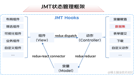 首先是自研了基于MVC模型的JMT状态管理框架,在redux的基础上,升级了状态的更新和变化响应机制,支持复杂异步状态管理,以一种通用状态模型支撑了数据产品逻辑的配置化。