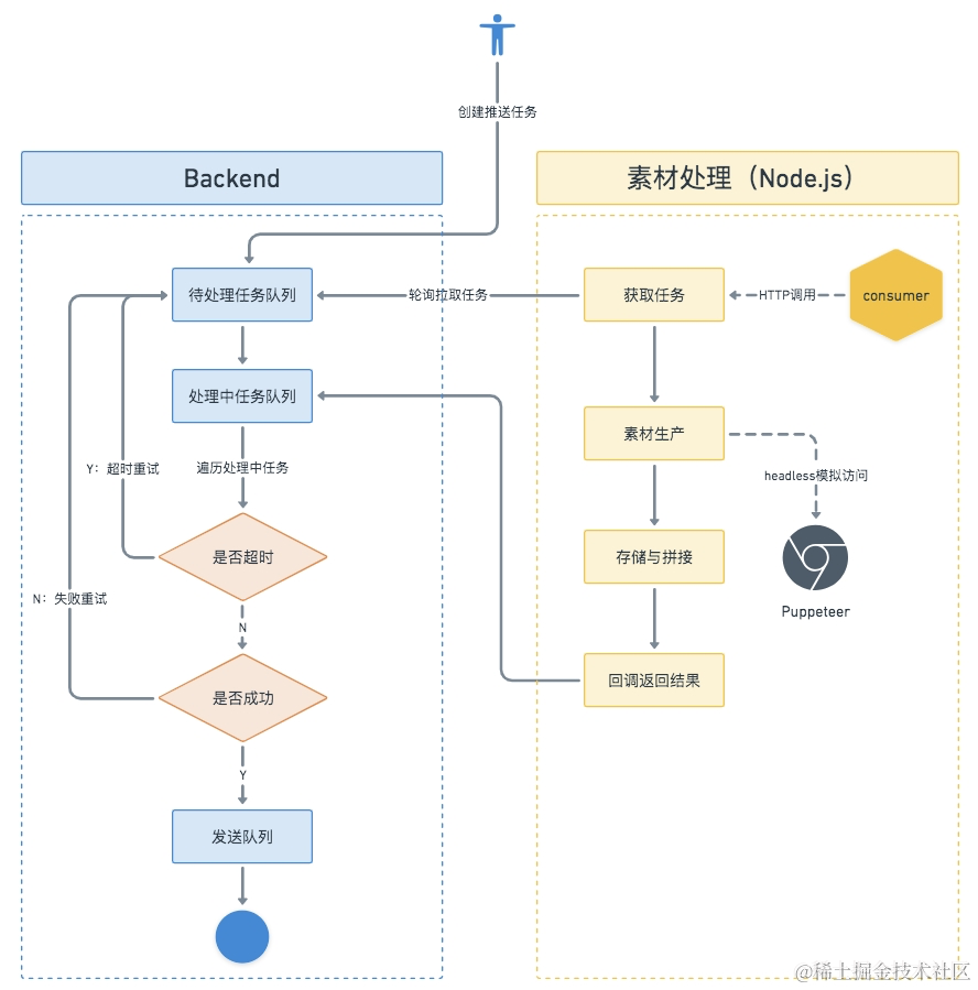 下图梳理出任务处理的关键流程:素材处理服务(Node)主要承担推送任务消费及提供获取素材的HTTP服务两大功能。在任务消费过程中,素材处理服务会模拟用户权限打开浏览器去做页面Canvas图像转换、看板截图、PDF生成等操作。如果触达方式为邮件,则会将所有素材填充生成为Email Html文本文件,通过回调返回给后端,推送给用户呈现的内容是数据看板。