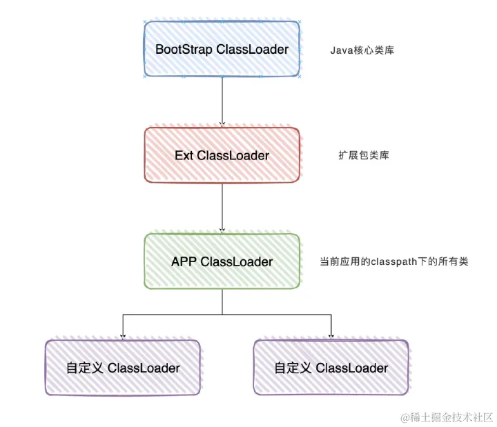 说到类加载,就不得不提Java体系中大名鼎鼎的“双亲委派模型”(英文描述为:parents delegation model)。有关这个描述,此处多说一点。中文含义中的“双”,其实在英文描述中并没有对应的描述,也即“双”不“双”,其实不紧要,紧要的是“委派”二字。“双亲委派模型”的核心内容,用稍粗鄙点的言语可以表述为:有事找爸爸(爸爸如果也有事,可以找他爸爸的爸爸,以此类推)。此设计理念的好处内外网相关文章介绍得较多,此处不在赘述。