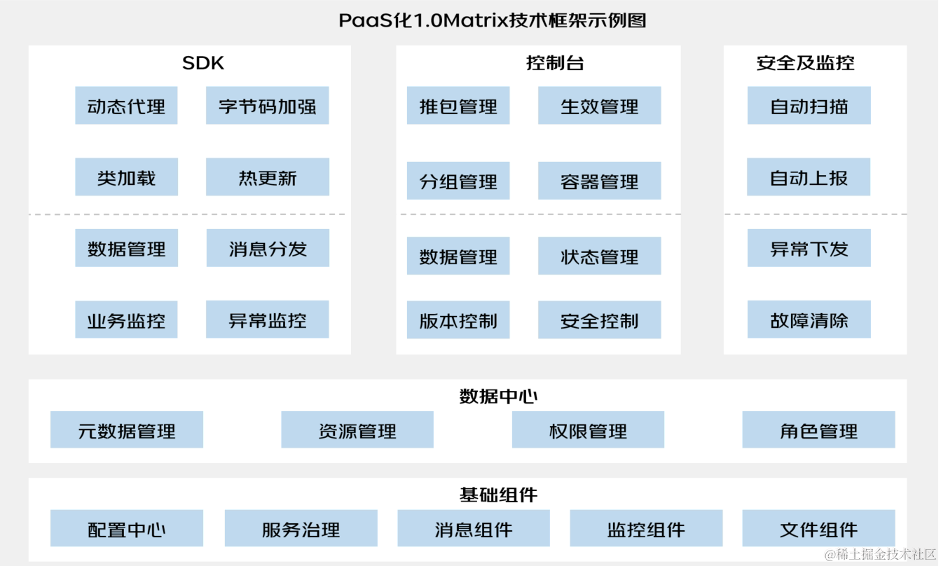 后续的内容,均会聚焦中台的底层技术支撑框架(后文简称为Matrix),来将中台、前台两方能力进行结合的技术细节和考虑点进行展开。