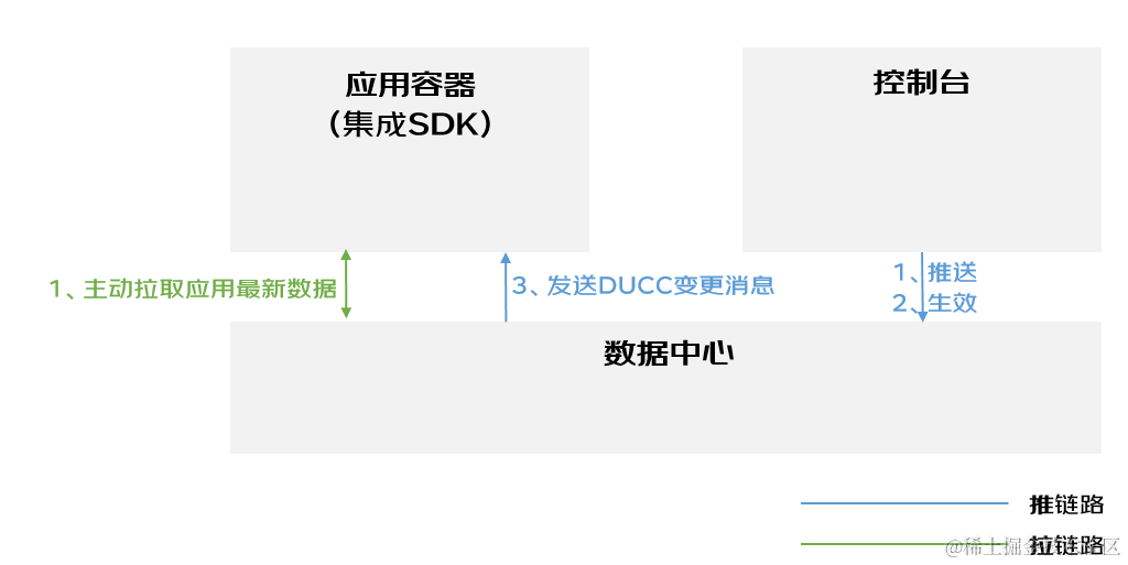 “推”链路适用的场景为:应用的场景为实时性要求较强的相关场景,包括但不限于新版本灰度及发布、版本回滚及控制、版本下线及监控等。此类场景要求在控制台执行相关的操作步骤后,控制台及相关的应用容器在短时间内(秒级或者毫秒级内)做出实时反映。主打的就是保障通知的及时性。