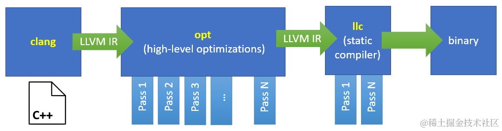 在 LLVM 内部,优化工作是通过一个个的 Pass(遍)来实现的,它支持三种类型的 Pass: