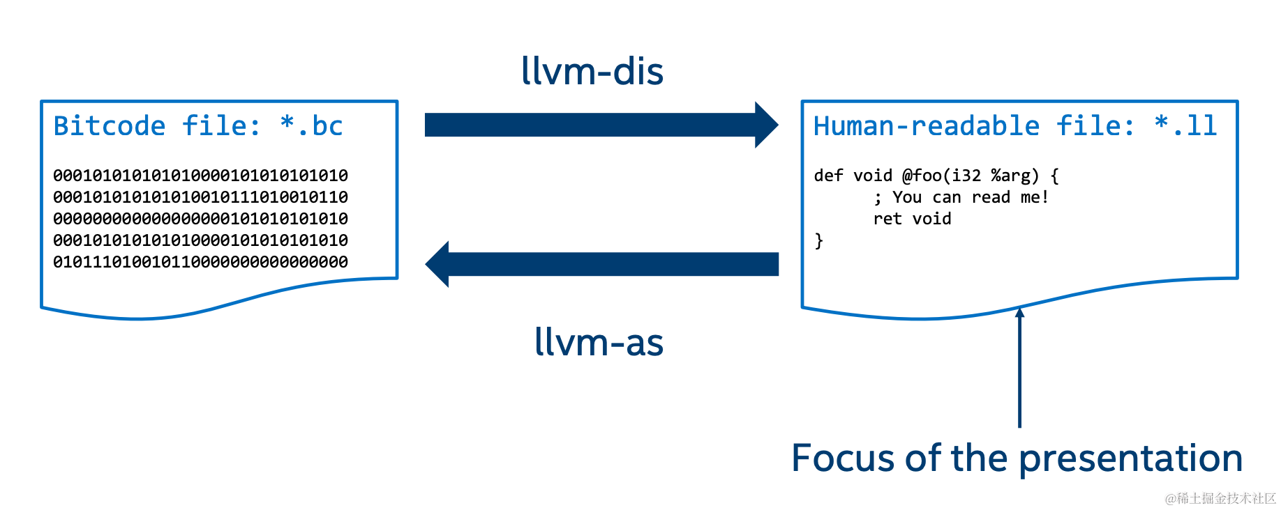 LLVM IR是一种基于静态单赋值(SSA)的表示法,提供了类型安全、底层操作、灵活性以及简洁地表示 高级语言的能力。它实际上有三种不同的表示方式,它们在功能上是等价的,但用途和表现形式各有不同。这三种表示分别是: