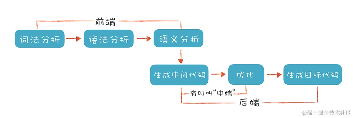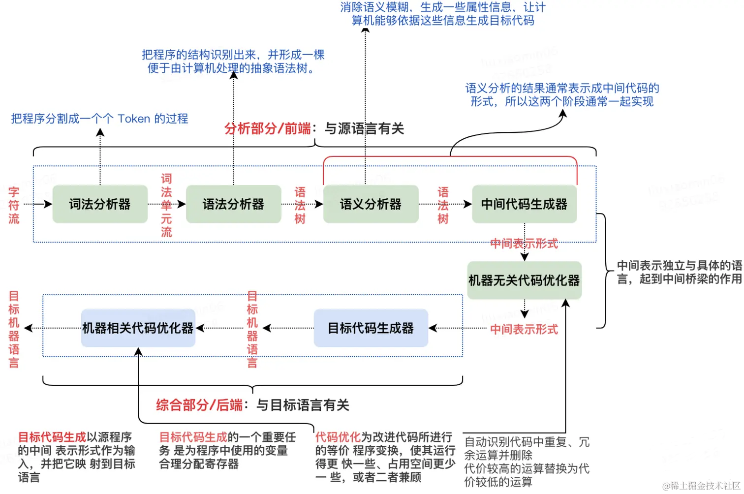 中端部分主要包含的功能有“生成中间代码”和“中间代码优化”。