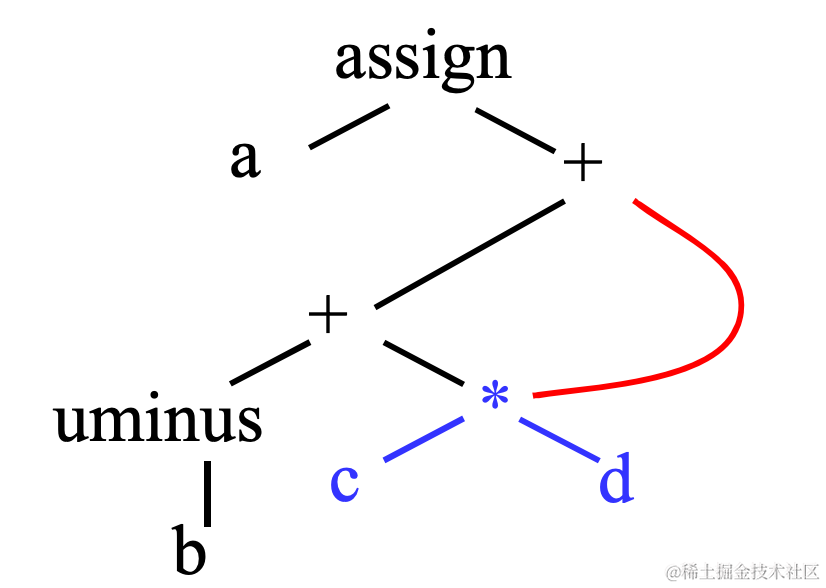 有向无环图是在树结构的基础上,消除了冗余的子树。其结点可以有多个父结点,相同子树可以被重用,可以理解为是一种具有共享机制的AST。表达式A对应的DAG为:
