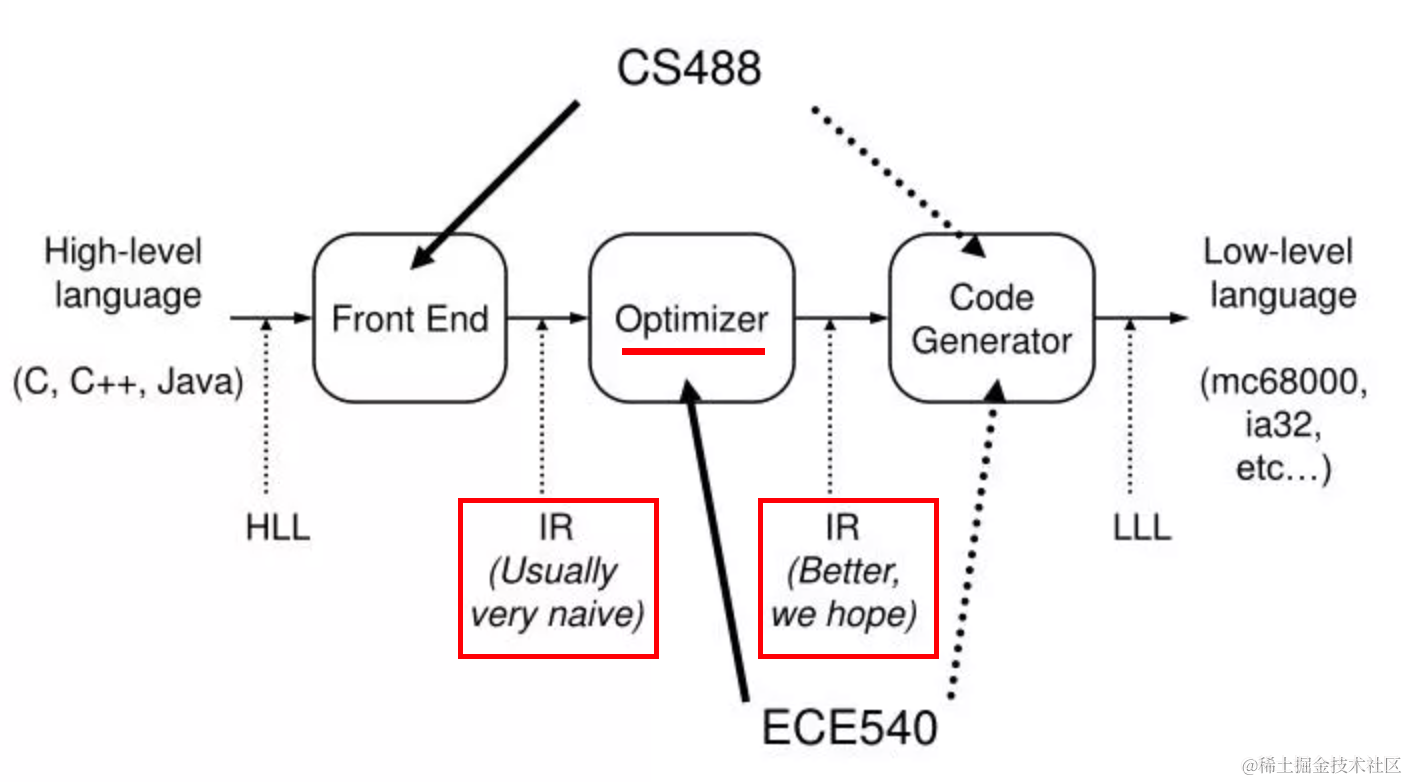 如果源语言语法结构较为简单,编译器可能会用唯一的IR,但如果源语言语法结构比较复杂,则在转换为目标语言的过程中可能会使用了一系列的IR,并通过转换进行大量的优化操作。