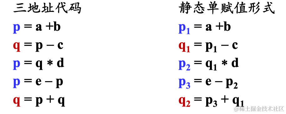 静态单赋值形式也是一种线性IR,它和三地址代码的主要区别在所有赋值指令都是对不同名字的变量的赋值。每个变量很确定地只会被定义一次,然后可以多次使用。这种特点使得基于SSA更容易做数据流分析,而数据流分析又是很多代码优化技术的基础,所以几乎所有语言的编译器、解释器或虚拟机中都使用了SSA。下图展示了两种表示方式的区别: