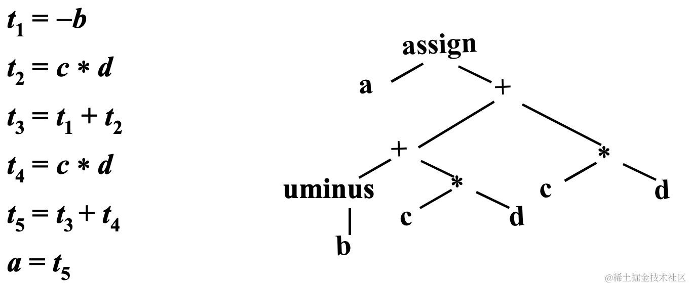 其中,op 是一个二元运算符,y 和 z 是操作数,可以是常量、变量或者临时变量,x 是存放结果的变量或临时变量。三地址代码也支持一元运算符,这种情况下指令的形式为: