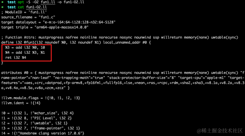 生成IR的命令可以直接带上优化参数生成优化后的结果:
