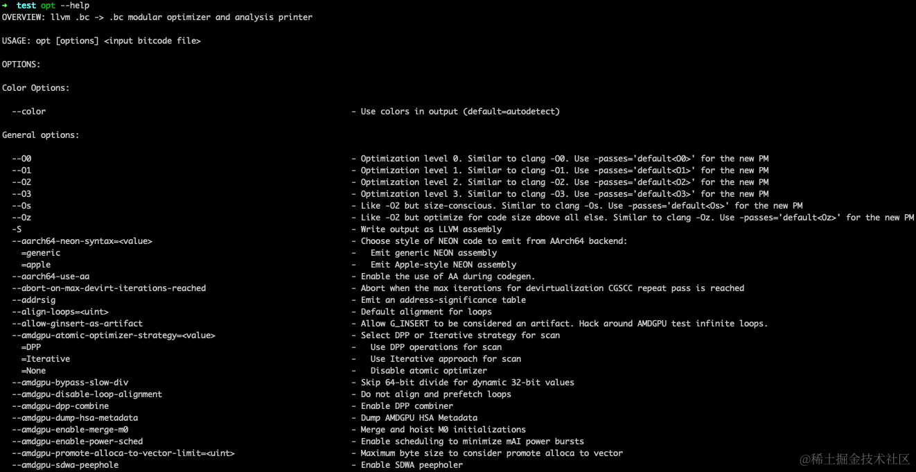 另外还有一个单独的命令opt用来做代码优化。缺省情况下,它的输入和输出都是.bc 文件,带上 -S 参数则可以直接对.ll 文件进行优化。用 opt --help 命令,可以查看 opt 命令所支持的所有优化算法。