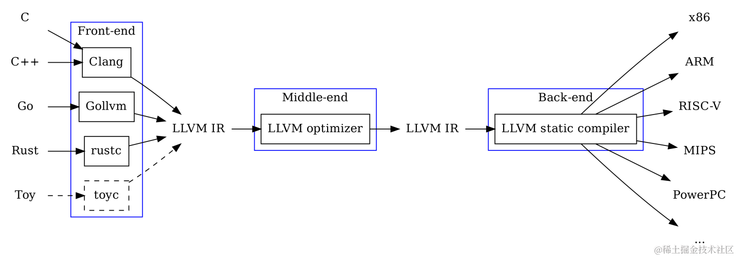 由于不同语言编译器中IR差异较大,本文后续内容对于概念部分只做点到即止的阐述,有兴趣的同学可以自行查阅资料,增加了LLVM的中间代码实操用来加深理解。LLVM 是一个开源的编译器基础设施项目,主要聚焦于编译器的后端功能(代码生成、代码优化、JIT……),其在业界被广泛应用,很多语言都是基于它实现的,更多信息可以查看官网。