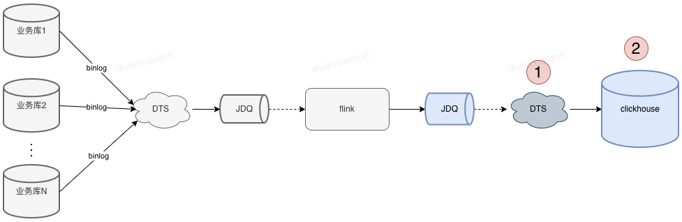 结合供应链的使用场景,这里在flink层加工完数据后没有直接将数据写入ClickHouse集群,而是发送到JDQ队列中。这样做的优势 1、加工和存储解藕 2、JDQ消息共享;