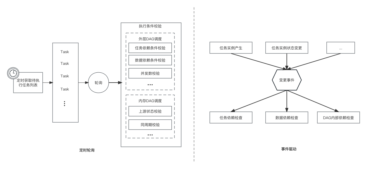 相比定时轮询,事件驱动不会采用定时拉取、全量校验的方式,而是在任务所依赖条件的状态发生变更时,才会基于事件做出相应的条件计算和校验动作,这样可以有效避免定时轮询面临的两个核心问题。同时针对不同的事件类型,可以分别进行异步并行处理,有效提升整体的处理性能。