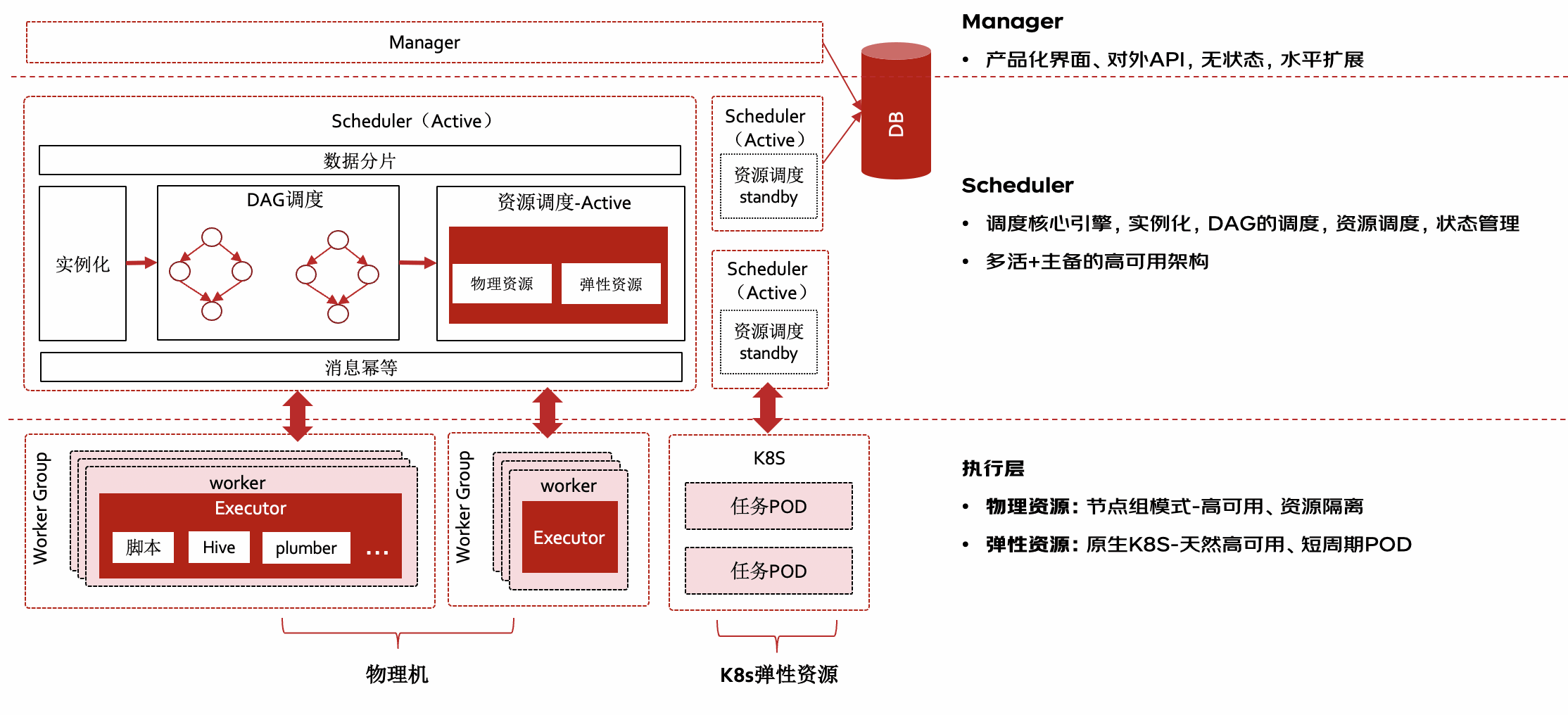 ◦主要提供产品化管理能力,包括任务的创建、任务管理、任务运维等,管理端无状态,可横向扩展,负载对外提供服务