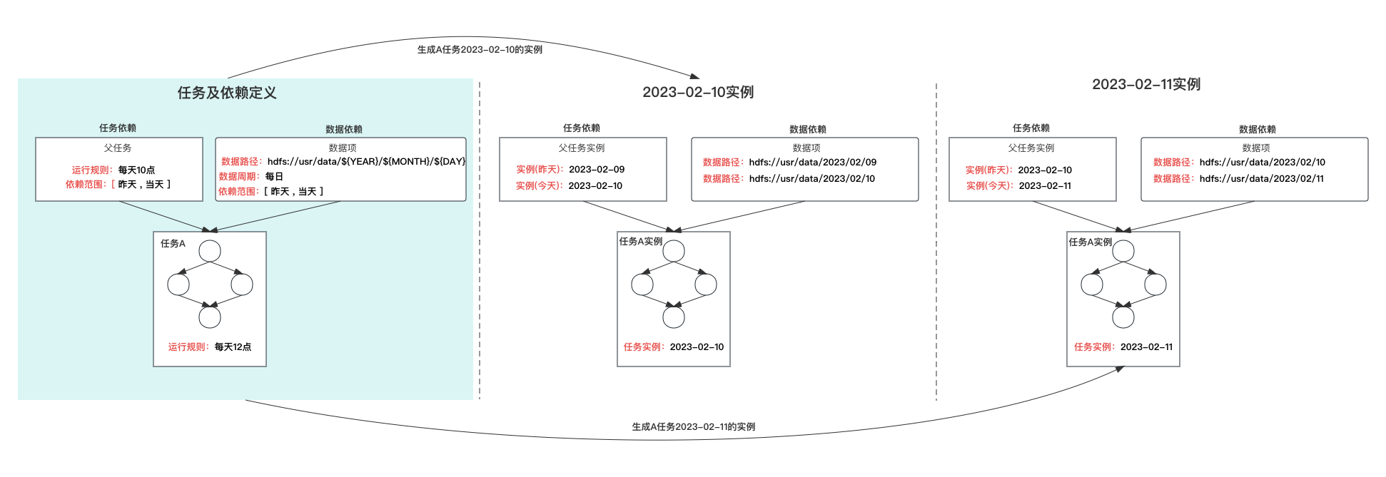 任务定义是任务配置的载体,无状态,不可执行,任务当到达运行周期时,会产生相应周期的任务实例(产生实例的过程叫“实例化”),实例化时会根据任务的配置信息,包括:环节、上游依赖、数据依赖、运行周期等,生成当前周期实例,可理解为任务的一个快照,任务实例是真正可执行、并具有状态的对象。