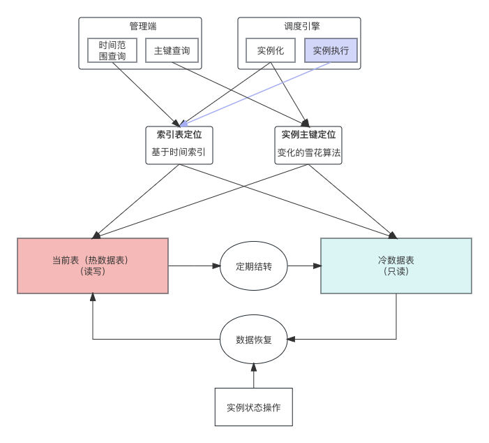 当数据结转到冷数据表后,这些实例的状态不会发生变更,单可能还会被未执行的实例所依赖,用户也可能会对这些实例做检索操作,所以这些实例需要能从冷数据表中快速被定位。