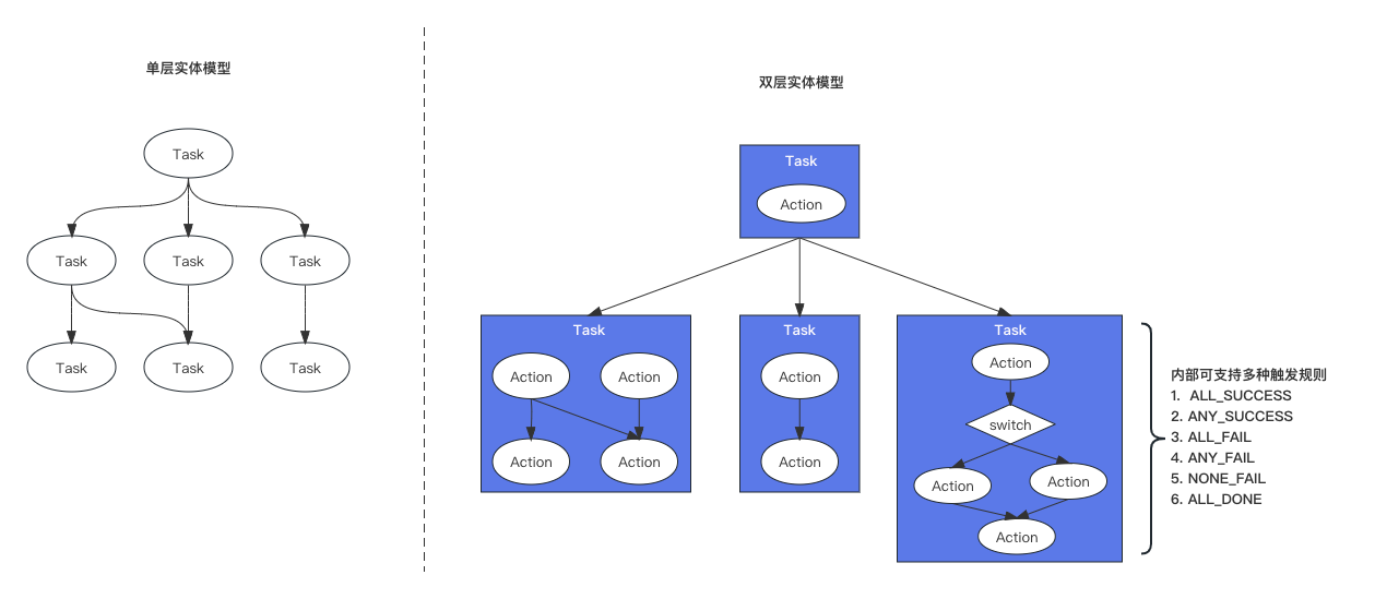 •Task(任务):任务是由一个或多个环节+触发规则构成的DAG,Task和Task之间也可以相互依赖,在外层构成一个DAG,实现双层调度。