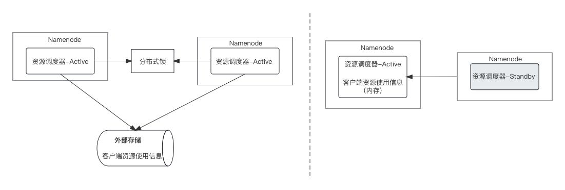 调度引擎namenode采用的是多活的高可用架构,如果资源调度部分也采用该架构(如左图),那么涉及到同一资源的并发访问和修改的问题,进而引入分布式锁和外部存储,这样整体的性能很难达到理想的目标。
