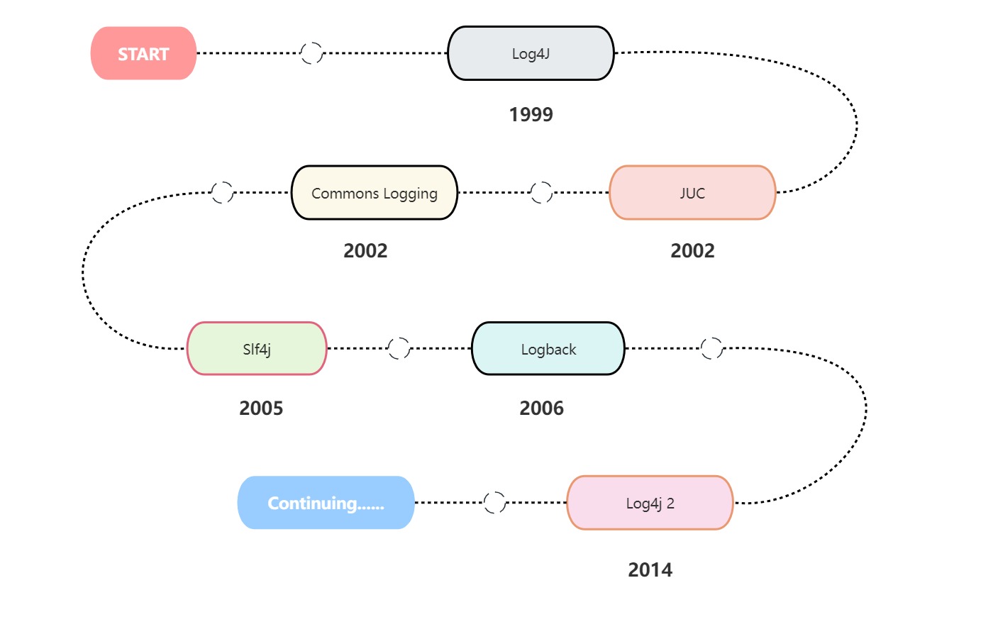 早期 Java 日志框架没有制定统一的标准,使得很多应用程序会同时使用多种日志框架。Java 日志框架的发展历程大致可分为以下几个阶段: