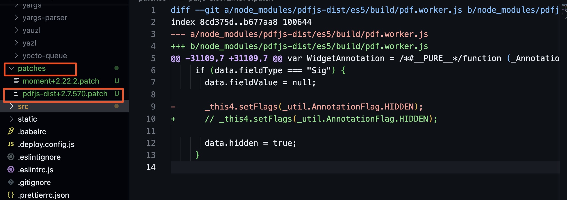 执行npx patch-package pdfjs-dist,生成补丁,会在文件目录中生成一个patches文件夹,如下:
