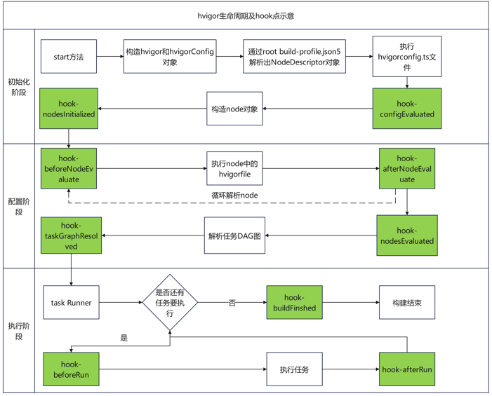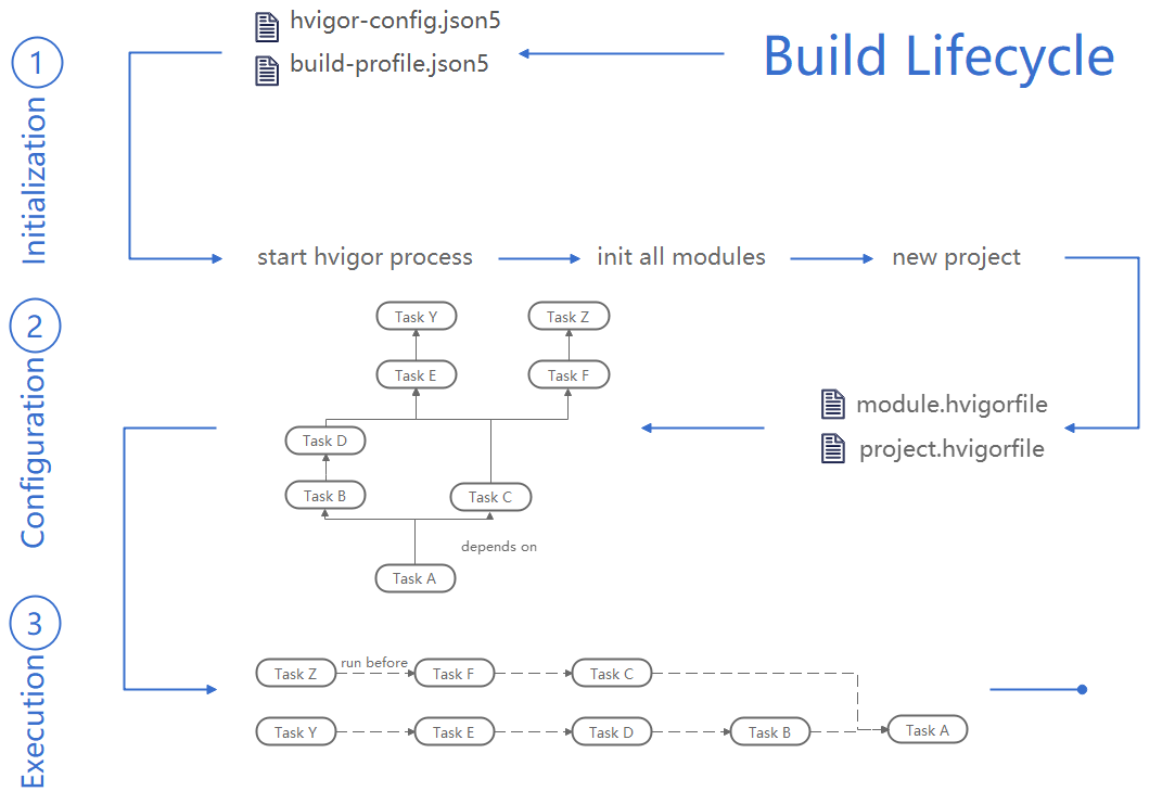 hvigor生命周期有3个阶段,分为初始化、配置和执行,hvigor会按顺序运行这些阶段,每个阶段都有特定的任务和目的。