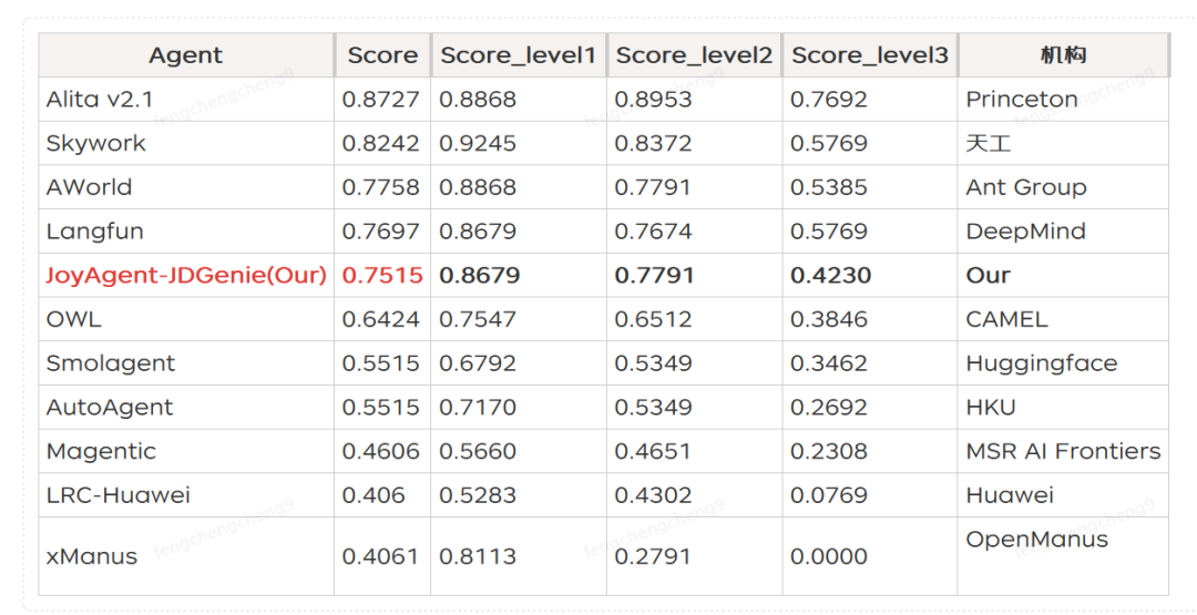 JoyAgent-JDGenie是一个通用的多智能体框架,对于用户需要定制的一些新场景功能,只需将相关的子智能体或者工具挂载到JoyAgent-Genie即可。为了验证JoyAgent-JDGenie的通用性,在GAIA榜单准确率达到75.15%,已超越OWL(CAMEL)、Smolagent(Huggingface)、LRC-Huawei(Huawei)、xManus(OpenManus)、AutoAgent(香港大学)等行业知名产品。