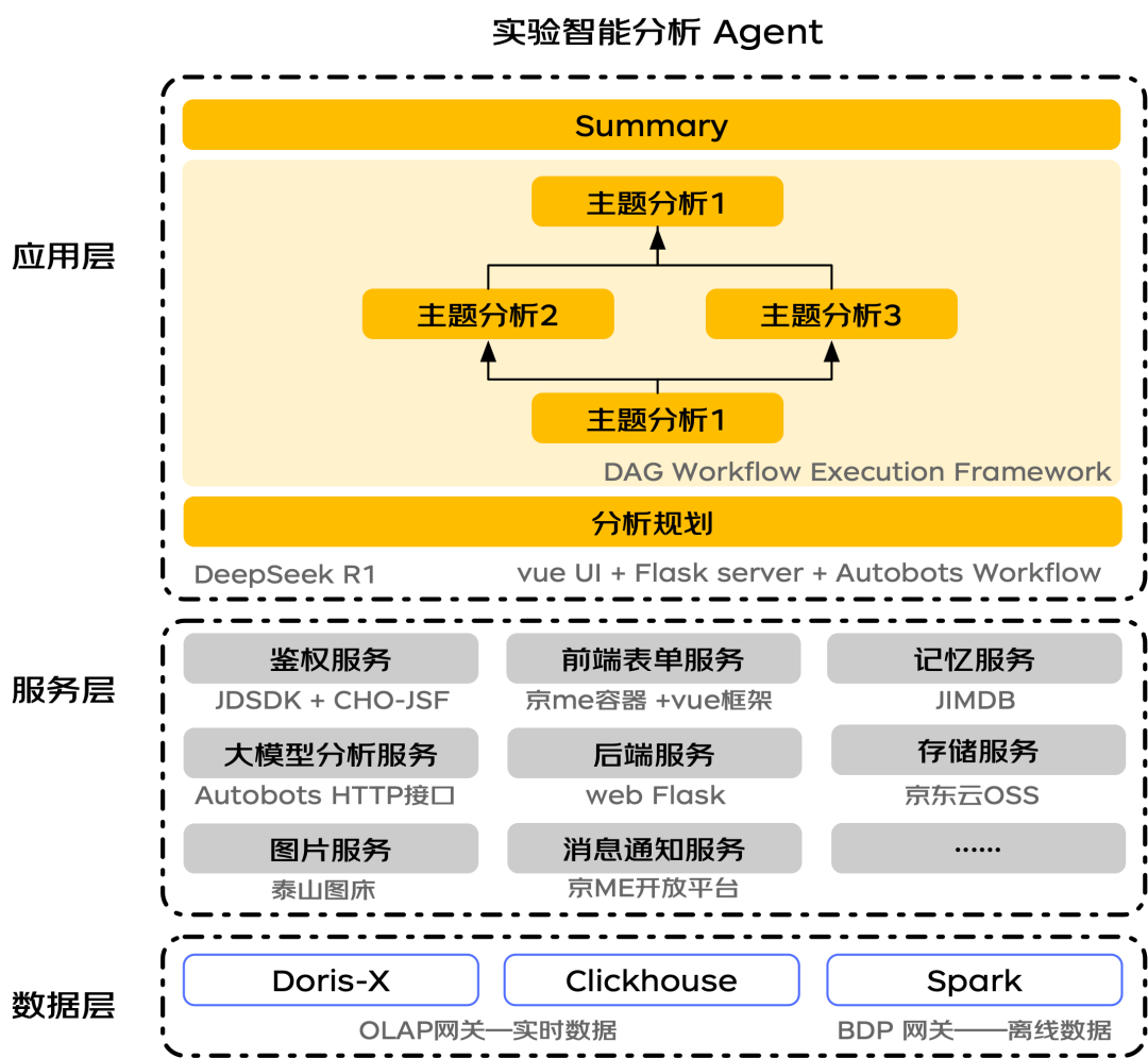 下图为Agent整体架构,采用模块化分层解耦设计,旨在实现“汇总数据—分项分析—总结呈现”的全流程智能化分析闭环。应用层作为核心业务中枢,集成了分析规划、主题分析(基于DAG Workflow Execution Framework实现任务编排)与结论汇总模块,并通过DeepSeek R1/V3模型提供分析支持,确保从宏观洞察到微观挖掘的灵活切换。服务层包含鉴权服务、前端表单服务等通用能力,选用JDSDK + CHO-JSF等公司内部成熟的技术方案,保障系统的高可用性与扩展性。数据层则依托Doris-X、Clickhouse、Spark等分布式引擎,构建OLAP网关(实时数据)与BDP网关(离线数据)双通道,既复用部门现有报告工具的指标体系,又通过独立开发的FDR分析模块实现特殊需求,在保持各工具独立性的同时完成数据统一拼接。