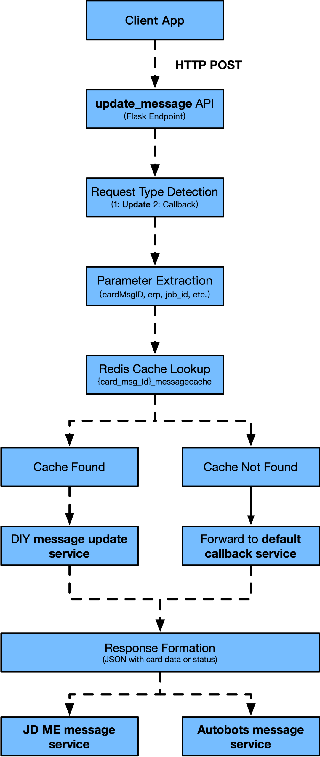 •消息更新服务动态路由框架:实现了京me机器人默认回调服务与自定义卡片更新服务的兼容(机器人对话 报告分析交互消息不冲突)