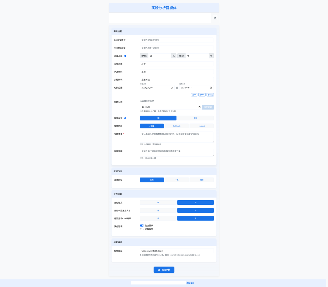 同时,实验分析Agent,需要用户根据自己的实验内容,给出实验ID、实验周期、实验模块、实验背景以及实验预期等信息。而3.1节提及,部分数据耦合不同已有工具来产出,其表单是差异化的。因此,设计了一个统一表单,并在后端将关键信息透传到不同工具服务,让用户没有体感上的差异。