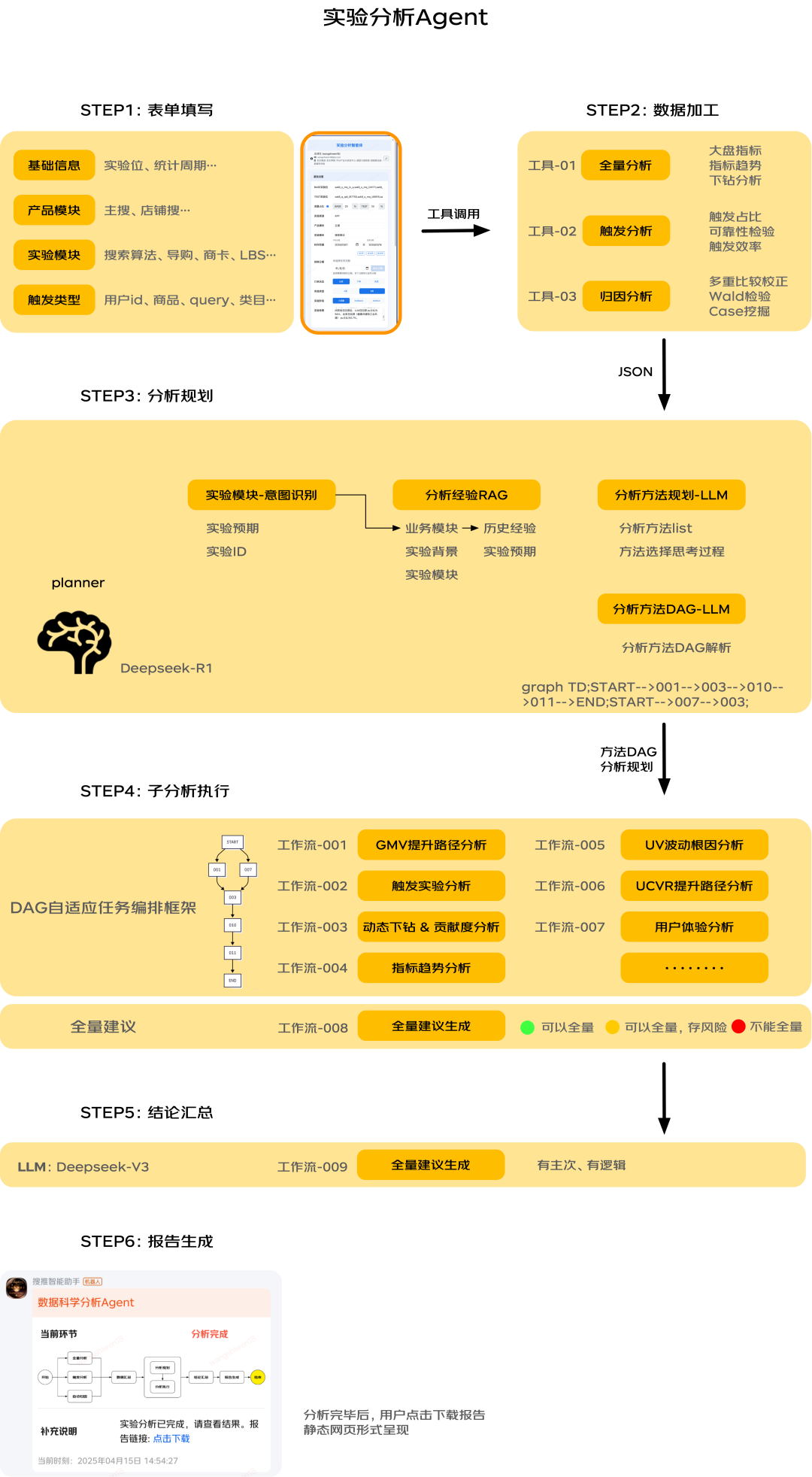 同时,实验分析Agent需用户输入实验ID、实验周期、实验模块、实验背景及实验预期等关键信息。然而,如3.1节所述,部分数据依赖于多个已有工具协同产出,且各工具对应的表单结构存在差异。为此,我们设计了一套统一的前端表单,通过后端将用户填写的关键信息透传至不同工具服务,在保证数据完整性和准确性的前提下,实现流程的透明化与标准化,让用户在整个过程中无感知差异,获得一致、流畅的使用体验。
