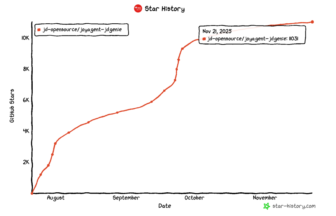 JoyAgent 是京东自主研发的智能体引擎平台。今年7月,其多智能体引擎模块 AutoBots(JDGenie)正式开源;9月,在 JDGenie 基础上进一步开源 DataAgent 能力,持续推进智能体技术在开源社区的共建与共享。当前已经Star数已经达到11k。