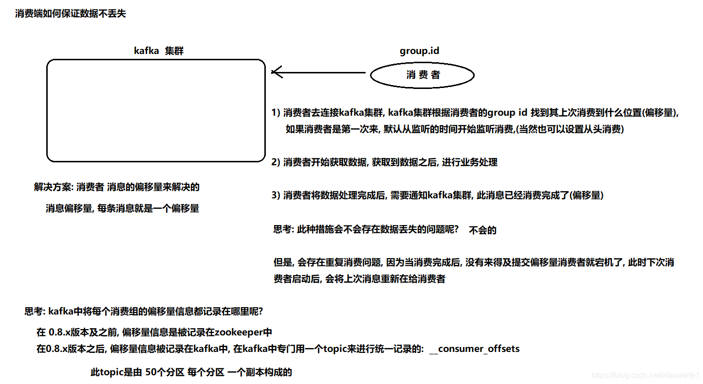 由于offset的提交是在消费消息之后,所以如果消费者消费完消息,还没有来得及提交offset,消费者端挂掉了,这样消费者重新起来后,会存在重复消费的情况。