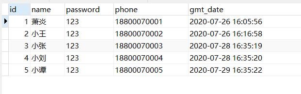 INSERT INTO `user` VALUES (5, '小谭', '123', '18800070005', '2020-07-29 16:35:22');