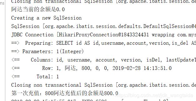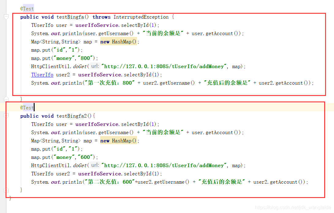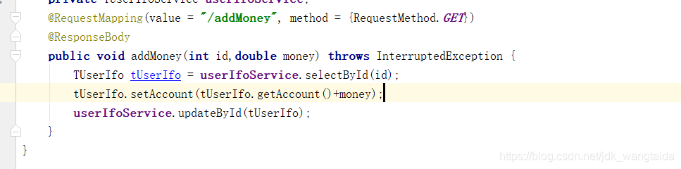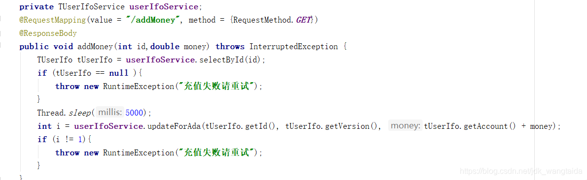 下面的是我们的接口,入参很简单,传用户的id和要充值的钱。业务逻辑很简单,先查一下用户这个对象,然后把金额改变一下,最后入库