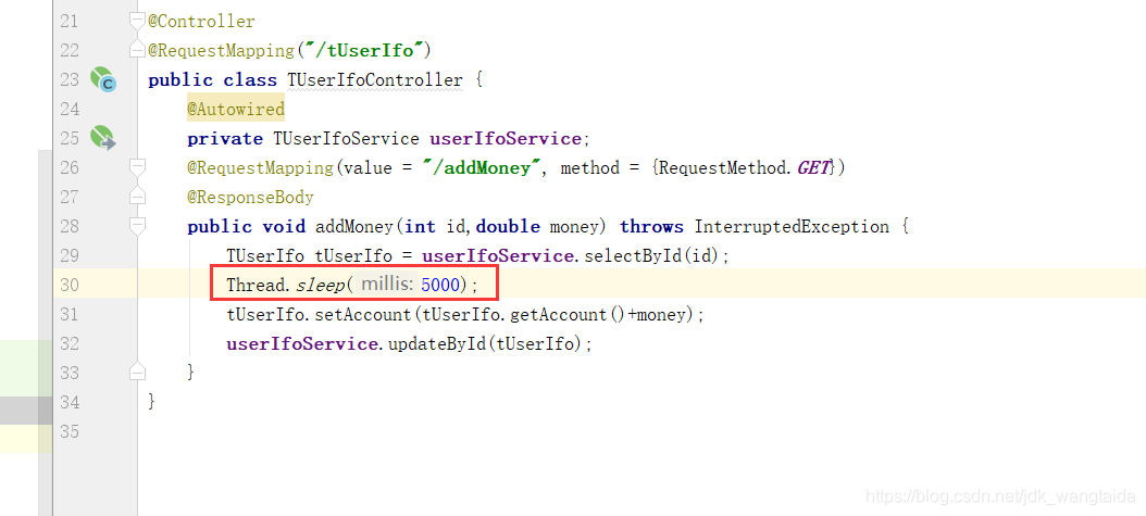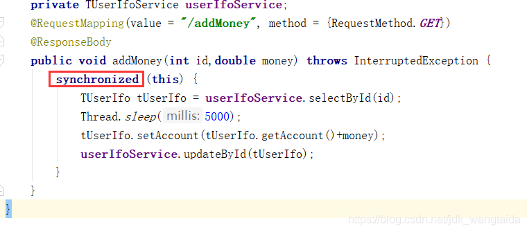 ②模拟下并发,在接口的代码里让线程休息5秒,这样做是为了让第一次调用的线程,在改数据之前等下第二个线程。(并发的情况是同时进来的,并不好模拟。这里我们投机一下,让线程等待一下,这样进来的两个线程就跟并发的类似)