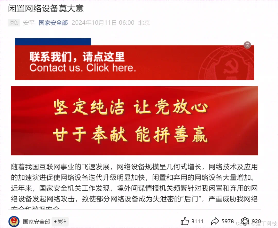 “随着我国互联网事业的飞速发展,网络设备规模呈几何式增长,网络技术及应用的加速演进促进网络设备迭代升级明显加快,闲置和弃用的网络设备大量增加。近年来,国家安全机关工作发现,境外间谍情报机关频繁针对我闲置和弃用设备发起网络攻击,致使部分网络设备成为失泄密的“后门”,严重威胁我网络安全和数据安全”。