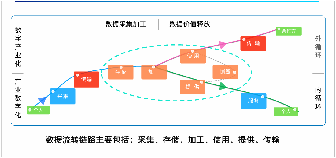 数据流转链路主要包括:采集、存储、加工、使用、提供、传输。数据要素外循环是构建数据要素市场的核心,需要解决数据权属、数据安全保障、数据流转合规等问题。